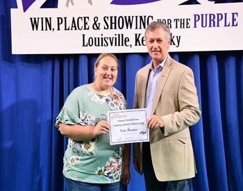 Katelyn Eathington, Avon, Ill., left, received the Angus Foundation Undergraduate $3,000 scholarship at the 2019 National Junior Angus Show (NJAS) Scholarship Presentation, July 18 in Louisville, Ky. Pictured presenting the award is Rod Schoenbine, Angus Foundation director of development. Since 1998, the Angus Foundation has awarded more than $2.9 million in undergraduate and graduate scholarships to Angus youth. Photo by Pearls Pics, on behalf of the American Angus Association.