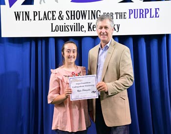 Lily Gisclair, Longville, La., left, received the Angus Foundation Undergraduate $3,000 scholarship at the 2019 National Junior Angus Show (NJAS) Scholarship Presentation, July 18 in Louisville, Ky. Pictured presenting the award is Rod Schoenbine, Angus Foundation director of development. Since 1998, the Angus Foundation has awarded more than $2.9 million in undergraduate and graduate scholarships to Angus youth. Photo by Pearls Pics, on behalf of the American Angus Association.