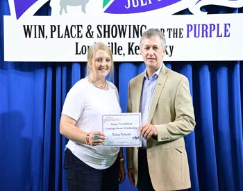 Taylor Glover, Pikeville, N.C., received the Angus Foundation Undergraduate $1,000 scholarship at the 2019 National Junior Angus Show (NJAS) Scholarship Presentation, July 18 in Louisville, Ky. Pictured presenting the award is Rod Schoenbine, Angus Foundation director of development. Since 1998, the Angus Foundation has awarded more than $2.9 million in undergraduate and graduate scholarships to Angus youth. Photo by Pearls Pics, on behalf of the American Angus Association.