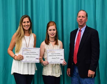 Sydni Lieneman, Princeton, Neb., left, and Lindsey Decker, Philo, Ill., center, received the Angus Foundation Undergraduate $5,000 scholarship at the 2019 National Junior Angus Show (NJAS) Scholarship Presentation, July 18 in Louisville, Ky. Pictured presenting the awards is James Coffey, Angus Foundation chairman. Since 1998, the Angus Foundation has awarded more than $2.9 million in undergraduate and graduate scholarships to Angus youth. Photo by Pearls Pics, on behalf of the American Angus Association.