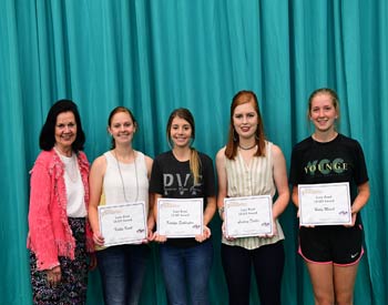 These junior members received the Gary Brost LEAD Conference Award at the 2019 National Junior Angus Show (NJAS) Scholarship Presentation, July 18 in Louisville, Ky. Pictured from left are Anne Patton Schubert, presenting; Kallie Knott, Laotto, Ind; Katelyn Eathington, Avon, Ill.; Lindsey Decker, Philo, Ill.; and Holly Marsh, Union, Ill. Photo by Pearls Pics, on behalf of the American Angus Association.