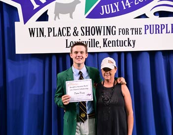 Dylan Denny, Lubbock, Texas, left, received the Joseph and Susanne Bush/J & S Ranch $500 Scholarship at the 2019 National Junior Angus Show (NJAS) Scholarship Presentation, July 18 in Louisville, Ky. Also pictured is Wendy Denny. Photo by Pearls Pics, on behalf of the American Angus Association.