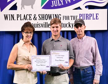 Daniel Williams, Milan, Ga., center, received the C.L. Cook Angus $1,500 Scholarship and the Ed and Wilma Minix/Black Witch Farm Angus Youth $4,000 Scholarship at the 2019 National Junior Angus Show (NJAS) Scholarship Presentation, July 18 in Louisville, Ky. Pictured presenting the awards are Carolyn Gazda, left, and David Gazda, right. Photo by Pearls Pics, on behalf of the American Angus Association.