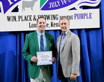 Daniel Rohrbaugh, Seven Valleys, Pa., left, received the Angus Foundation Undergraduate $3,000 scholarship at the 2019 National Junior Angus Show (NJAS) Scholarship Presentation, July 18 in Louisville, Ky. Pictured presenting the award is Rod Schoenbine, Angus Foundation director of development. Since 1998, the Angus Foundation has awarded more than $2.9 million in undergraduate and graduate scholarships to Angus youth. Photo by Pearls Pics, on behalf of the American Angus Association.