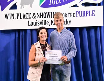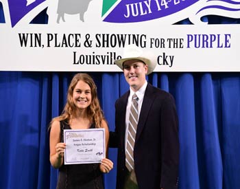 Garrett Bromenshenk, Billings, Mont., right, received the Montana Angus Youth $2,000 Scholarship at the 2019 National Junior Angus Show (NJAS) Scholarship Presentation, July 18 in Louisville, Ky. Pictured presenting the award is Julie Murnin. Since 1998, the Angus Foundation has awarded more than $2.9 million in undergraduate and graduate scholarships to Angus youth. Photo by Pearls Pics, on behalf of the American Angus Association.