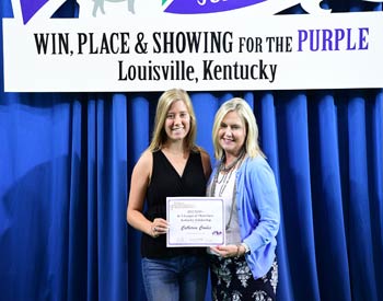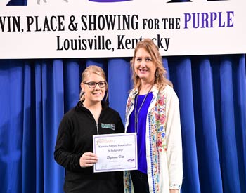 Bryanna Hite, Valley Center, Kan., left, received the Kansas Angus Association $1,000 Scholarship at the 2019 National Junior Angus Show (NJAS) Scholarship Presentation, July 18 in Louisville, Ky. Pictured presenting is Anne Lampe. Since 1998, the Angus Foundation has awarded more than $2.9 million in undergraduate and graduate scholarships to Angus youth. Photo by Pearls Pics, on behalf of the American Angus Association.