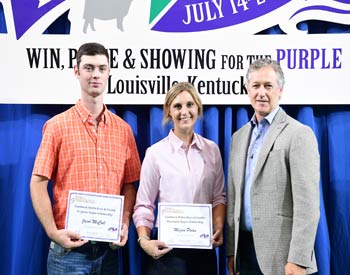 Jacob McCall, Greenville, Va., left, and Megan Pelan, Jefferson, Md., center, received the Gordon and Robin Keys and Family $1,250 Angus Scholarship at the 2019 National Junior Angus Show (NJAS) Scholarship Presentation, July 18 in Louisville, Ky. Pictured presenting the scholarships is Rod Schoenbine, Angus Foundation director of development. Since 1998, the Angus Foundation has awarded more than $2.9 million in undergraduate and graduate scholarships to Angus youth. Photo by Pearls Pics, on behalf of the American Angus Association.