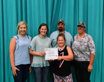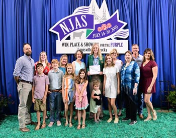 Caroline Cowles, Rockfield, Ky., center, received the Joe Bill Meng Memorial $1,000 Angus Scholarship at the 2019 National Junior Angus Show (NJAS) Scholarship Presentation, July 18 in Louisville, Ky. Pictured presenting the scholarship is the Meng Family. Since 1998, the Angus Foundation has awarded more than $2.9 million in undergraduate and graduate scholarships to Angus youth. Photo by Pearls Pics, on behalf of the American Angus Association.