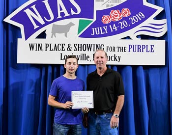 Cale Hinrichsen, Westmoreland, Kan., left, received the NJAA Alumni and Friends $2,000 Scholarship at the 2019 National Junior Angus Show (NJAS) Scholarship Presentation, July 18 in Louisville, Ky. Pictured presenting the award is James Coffey, Angus Foundation chairman. Since 1998, the Angus Foundation has awarded more than $2.9 million in undergraduate and graduate scholarships to Angus youth. Photo by Pearls Pics, on behalf of the American Angus Association.