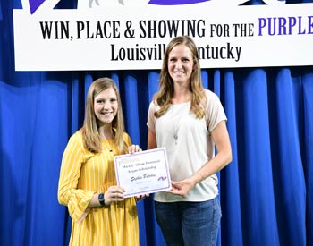 Sophia Patchin, Mitchellville, Iowa, left, received the Mack C. Olson Memorial $700 Angus Scholarship at the 2019 National Junior Angus Show (NJAS) Scholarship Presentation, July 18 in Louisville, Ky. Also pictured is Esther McCabe, presenting. Since 1998, the Angus Foundation has awarded more than $2.9 million in undergraduate and graduate scholarships to Angus youth. Photo by Pearls Pics, on behalf of the American Angus Association.