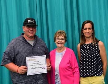 Garrett Handsaker, Pearl City, Ill., left, received the Stan J. Prox LEAD Conference Award at the 2019 National Junior Angus Show (NJAS) Scholarship Presentation, July 18 in Louisville, Ky. Pictured presenting the award are Linda Prox, center, and Colette Culbertson, right. Photo by Pearls Pics, on behalf of the American Angus Association.