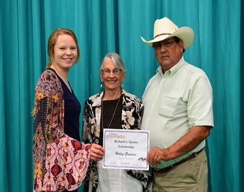 Haley Greiman, Perry, Iowa, left, received a $5,000 scholarship in memory of Richard L. "Dick" Spader, former American Angus Association executive vice president at the 2019 National Junior Angus Show (NJAS) Scholarship Presentation, July 18 in Louisville, Ky. Pictured presenting the award are Frances & Charles Cannon. Since 1998, the Angus Foundation has awarded more than $2.9 million in undergraduate and graduate scholarships to Angus youth. Photo by Pearls Pics, on behalf of the American Angus Association.