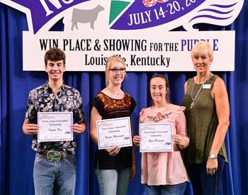 These junior members received the Texas Angus Association $1,000 Scholarships at the 2019 National Junior Angus Show (NJAS) Scholarship Presentation, July 18 in Louisville, Ky. Pictured from left are Cooper Free, accepting on behalf of Kaydee Free, Salado, Texas; Kristen Massingill, Hamilton, Texas; Rylie Philipello, Bryan, Texas; and Cindy Ahearn, presenting. Since 1998, the Angus Foundation has awarded more than $2.9 million in undergraduate and graduate scholarships to Angus youth. Photo by Pearls Pics, on behalf of the American Angus Association.