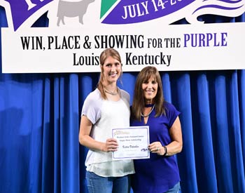Katia Voloshin, Craig, Colo., left, received the Western States National Junior Angus Show $500 Scholarship at the 2019 National Junior Angus Show (NJAS) Scholarship Presentation, July 18 in Louisville, Ky. Pictured presenting the award is Kathi Creamer. Since 1998, the Angus Foundation has awarded more than $2.9 million in undergraduate and graduate scholarships to Angus youth. Photo by Pearls Pics, on behalf of the American Angus Association.
