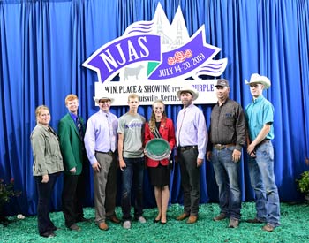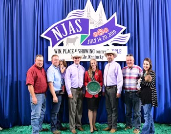 Jayce Dickerson, Paradise, Kan., won premier junior breeder at the 2019 National Junior Angus Show (NJAS), July 14-20 in Louisville, Ky. Pictured from left are Stephanie Dickerson; Grady Dickerson; Andy Higgins, judge; Jayce Dickerson; Madison Weaver, Miss American Angus; Scott Bush, judge; David Dickerson; and Ethan Dickerson. Photo by Pearls Pics, on behalf of the American Angus Association.