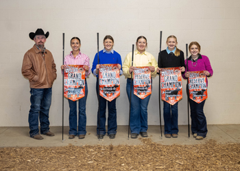 These Nebraska junior Angus members won top honors in their respective showmanship divisions at the 2025 Nebraska Junior Angus Association Winter Kickoff Show, Dec. 7 in Kearney, Neb. Pictured from left are Tyler Hahn, judge; Kasey Meyer, Blue Hill, Neb., senior champion; Kaelyn Schilling, Goodland, Kan., intermediate champion; McKinley Stoller, Palisade, Neb., reserve intermediate champion; Addison Dalrymple, Arnold, Neb., junior champion; and Zoey Malander, Belgrade, Neb., reserve junior champion. Photo by Kyra Meyer.