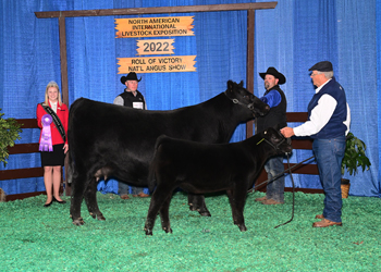 Snyders CCW Proven Queen 214 won grand champion cow-calf pair at the 2022 North American International Livestock Exposition (NAILE) Super Point Roll of Victory (ROV) Angus Show, Nov. 14 in Louisville, Ky. Madison Stratton, Appomattox, Va., owns the February 2019 daughter of Colburn Primo 5153. A March 2022 heifer calf sired by PVF Blacklist 7077 completes the winning pair. John Rayfield, Wolfforth, Texas, evaluated the 181 entries. Photo by Linde's Livestock Photos LLC.