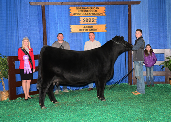 SCC Heart N Sole 153 won reserve intermediate champion heifer at the 2022 North American International Livestock Exposition (NAILE) Super Point Roll of Victory (ROV) Angus Show, Nov. 14 in Louisville, Ky. Delaney Jones, Harrod, Ohio, owns the winning heifer. Photo by Linde's Livestock Photos LLC.