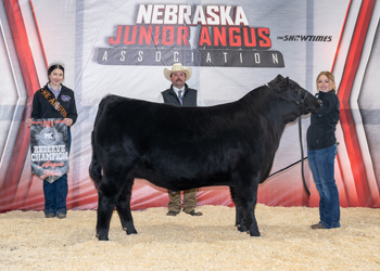 4M Reckoning 452 won reserve grand champion bred-and-owned bull at the 2025 Nebraska State Junior Angus Show, June 6-8 in Broken Bow, Neb. Kasey Meyer, Blue Hill, Neb., owns the February 2024 son of Hill Valley Reckoning 931. Carter Ward, Plattsburg, Mo., evaluated the 58 entries. Photo by Kyra Meyer.