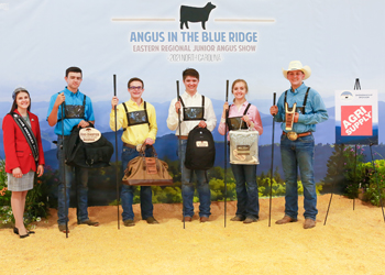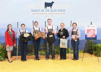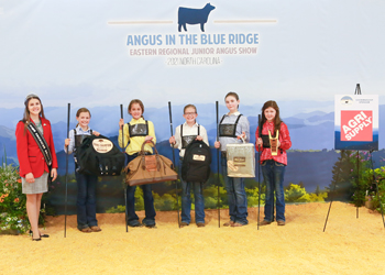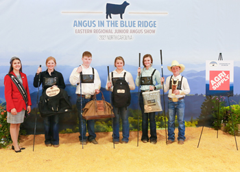 These juniors won senior showmanship at the 2021 Eastern Regional Junior Angus Show, June 26-28 in Fletcher, N.C. Pictured from left are Miss American Angus Ellie Kidwell; Marcie Harward, Richfield, N.C., champion; Elizabeth Voight, Fredericksburg, Pa., reserve champion; Zach McCall, Greenville, Va., third place; Keri Felumlee, Newark, Ohio, fourth place; and Mattie Harward, Richfield, N.C., fifth place. Photo by Next Level Images.