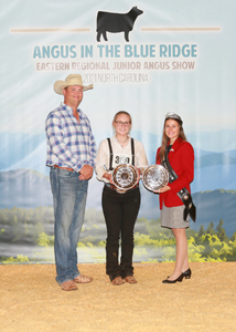 Allison Davis, Shelbyville, Tenn., center, won premier junior breeder and exhibitor at the 2021 Eastern Regional Junior Angus Show, June 26-28 in Fletcher, N.C. Also pictured are Jeff Jackson, judge, left, and Miss American Angus Ellie Kidwell. right, both presenting. Photo by Next Level Imaging.