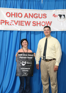 Emma Grafft, Middletown, Ohio, left, won the herdsman award at the 2021 Ohio Angus Association Preview Show, June 20 in Washington Courthouse, Ohio. Also pictured is Corbin Cowles, judge, right. Photo by Alex Tolbert, American Angus Association.