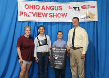 Maggie Davis and Logan Davis, both of Bidwell, Ohio, tied for premier exhibitor at the 2021 Ohio Angus Association Preview Show, June 20 in Washington Courthouse, Ohio. Pictured from left are Lindsey Hall, presenting; Maggie Davis, recipient; Logan Davis, recipient; and Corbin Cowles, judge. Photo by Alex Tolbert, American Angus Association.