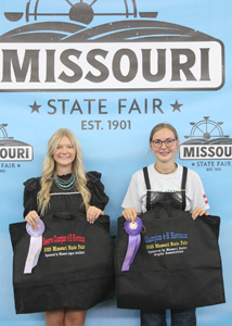 Faith Williams, Rhineland, reserve champion, left, and Eden Uhing, Ava, champion, right, won overall showmanship at the 2025 Missouri State Fair 4-H Angus Show, Aug. 7 in Sedalia, Mo. Photo by Adam Conover, American Angus Association.