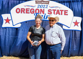 Holly Berry, Port Orchard, Wash., left, won herdsmanship of the year at the 2022 Oregon State Fair Roll of Victory (ROV) Angus Show, Aug. 29 in Salem, Ore. Pictured presenting the award is Dick Hubman, Oregon Angus Association president, right. Photo by Katelyn McCoy.