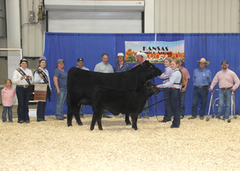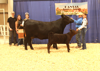 RW Saras Dream 308 won supreme champion and grand champion cow-calf pair at the 2025 Kansas Junior Angus Association Preview Show, June 7-8 in Hutchinson, Kan. Kelsey Theis, Leavenworth, Kan., owns the April 2023 daughter of Silveiras Style 9303. A March 2025 bull calf sired by Bar S Cowboy Up 3452 completes the winning pair. Jim Pipkin, Republic, Mo., evaluated the 102 entries. Photo by Jeff Mafi, American Angus Association.