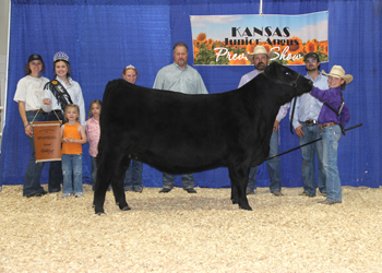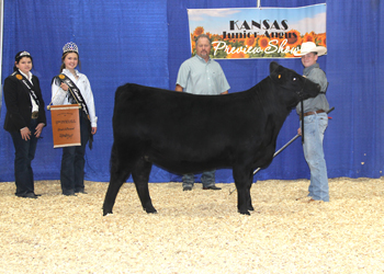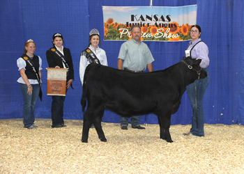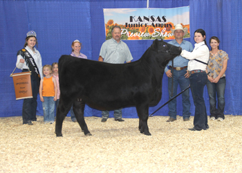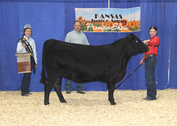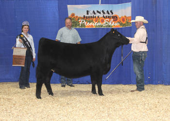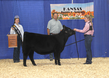 PRDX Erica 422 3616 won grand champion phenotype and genotyple female at the 2025 Kansas Junior Angus Association Preview Show, June 7-8 in Hutchinson, Kan. Macey Lewis, Iola, Kan., owns the September 2023 daughter of SG Salvation. Jim Pipkin, Republic, Mo., evaluated the 102 entries. Photo by Jeff Mafi, American Angus Association.
