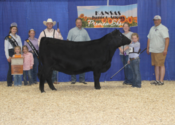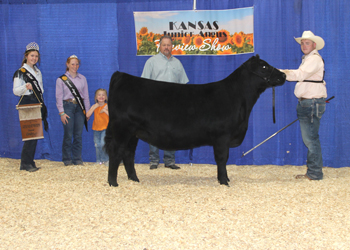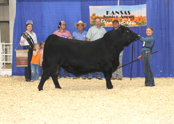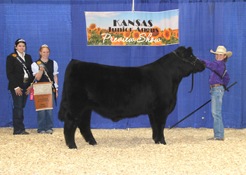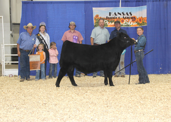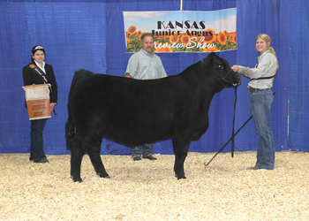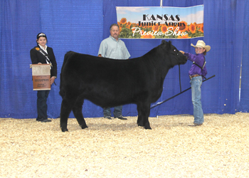 Laflins Ramesses 3695 won grand champion bred-and-owned bull at the 2025 Kansas Junior Angus Association Preview Show, June 7-8 in Hutchinson, Kan. Ellie Laflin, Olsburg, Kan., owns the October 2023 son of Boyd Justification. Jim Pipkin, Republic, Mo., evaluated the 102 entries. Photo by Jeff Mafi, American Angus Association.