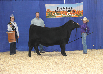 BOY Blackbird M203 won fourth overall owned champion female at the 2025 Kansas Junior Angus Association Preview Show, June 7-8 in Hutchinson, Kan. Clara Stump, Saint John, Kan., owns the September 2024 daughter of BNWZ Dignity 8017. Jim Pipkin, Republic, Mo., evaluated the 102 entries. Photo by Jeff Mafi, American Angus Association.