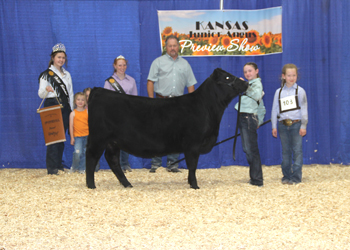 Navinsky Bros Elsa 4959 won grand champion bred-and-owned female at the 2025 Kansas Junior Angus Association Preview Show, June 7-8 in Hutchinson, Kan. Cohen Navinsky, Easton, Kan., owns the April 2024 daughter of STAG Good Times 201 ET. Jim Pipkin, Republic, Mo., evaluated the 102 entries. Photo by Jeff Mafi, American Angus Association.