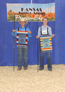 These junior Angus members won top honors in junior showmanship at the 2025 Kansas Junior Angus Association Preview Show, June 7-8 in Hutchinson, Kan. Pictured from left are Jett McCurry, Colwich, Kan., champion; and Evelyn Clark, Lecompton, Kan., reserve champion. Photo by Jeff Mafi, American Angus Association.