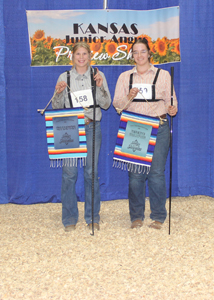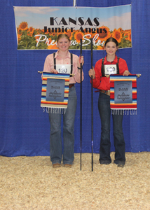 These junior Angus members won top honors in senior showmanship at the 2025 Kansas Junior Angus Association Preview Show, June 7-8 in Hutchinson, Kan. Pictured from left are Lilly Hinkson, Cottonwood Falls, Kan., champion; and LaiCee Scott, Council Grove, Kan., reserve champion. Photo by Jeff Mafi, American Angus Association.