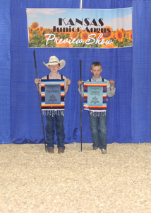 Drew McCurry, Hutchinson, Kan., champion, left; and Jance Mosbarger, Goodland, Kan., reserve champion, right, won top honors in the novice showmanship division at the 2025 Kansas Junior Angus Association Preview Show, June 7-8 in Hutchinson, Kan. Photo by Jeff Mafi, American Angus Association.