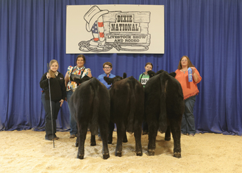 Cammie Rone, Courtland, Miss., won junior get-of-sire at the 2026 Dixie National Roll of Victory (ROV) Angus Show, Feb. 21 in Jackson, Miss. Cea Guns N Roses sired the winning group. Photo by Richmond Photography.