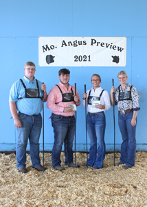 These junior Angus members qualified to represent Missouri at the National Junior Angus Showmanship Contest held in conjunction with the National Junior Angus Show this July in Grand Island, Neb. and are pictured at the 2021 Missouri Angus Association Preview Show, June 13 in Sedalia, Mo. Pictured from left are Garrett Schuering, Thompson, alternate; Nick Rhodes, Brookfield, representative; Ciara Raithel, Mexico, representative; and Allena Allen, Trenton, alternate. Photo by Adam Conover, American Angus Association.