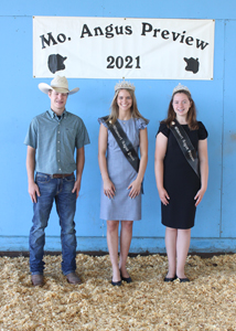 These junior members were crowned Angus royalty and are pictured at the 2021 Missouri Angus Association Preview Show, June 13 in Sedalia, Mo. Pictured from left are Kyle Houston, Savannah, Angus ambassador; Ella Jordan, Savannah, Miss Missouri Angus; and Josey Meier, Jackson, Angus princess. Photo by Adam Conover, American Angus Association.