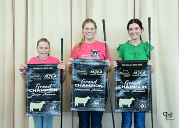 These junior Angus members won top honors in their divison of showmanship at the 2025 Missouri Junior Angus Preview Show at the Missouri Cattlemen's Association All-Breeds Show, June 14 in Sedalia, Mo. Pictured from left are Connelly Ward, Oak Grove, Mo., junior champion; Bailey Schuering, Thompson, Mo., intermediate champion; and Kinleigh Bolin, Walnut Grove, Mo., senior champion. Photo by Pearl's Pics.
