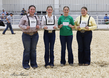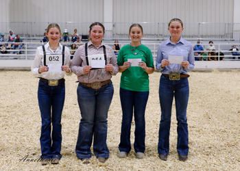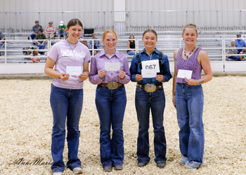 These junior Angus members won top honors in the junior division of team sales at the 2025 Kansas Junior Angus Association Preview Show awards ceremony, June 8 in Hutchinson, Kan. Pictured from left are Aubree McCurry, Hutchinson, first place; Avery Mullen, second place, and Hallie Mullen, third place, both of Ulysses; and Ruby Hill, Baldwin City, fourth place. Photo by Anne Lampe.