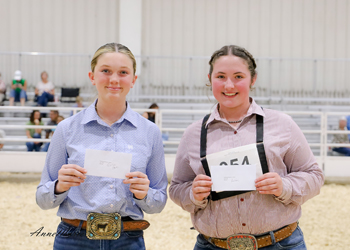 Eliza Rosenhagen, Cheney, left, and Molly Hill, Baldwin City, right, won top honors in the intermediate division of prepared public speaking at the 2025 Kansas Junior Angus Association Preview Show awards ceremony, June 8 in Hutchinson, Kan. Photo by Anne Lampe.