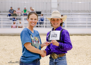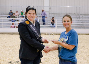 Addison Burns, Valley Falls, left, received the Kansas Angus Auxiliary Challenge Award at the 2025 Kansas Junior Angus Association Preview Show awards ceremony, June 8 in Hutchinson, Kan. Pictured presenting the award is Emily Mullen, Kansas Angus Auxiliary vice president, right. Photo by Anne Lampe.