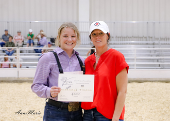 Kelsey Theis, Leavenworth, left, received the Kansas Angus Auxiliary scholarship at the 2025 Kansas Junior Angus Association Preview Show awards ceremony, June 8 in Hutchinson, Kan. Pictured presenting the scholarship is Ashley Navinsky, Kansas Angus Auxiliary scholarship chairman, right. Photo by Anne Lampe.