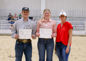 Jackson McCurry, Colwich, left; and Addie Haverkamp, Bern, center, received the Kansas Angus Auxiliary scholarship at the 2025 Kansas Junior Angus Association Preview Show awards ceremony, June 8 in Hutchinson, Kan. Pictured presenting the scholarships is Ashley Navinsky, Kansas Angus Auxiliary scholarship chairman, right. Photo by Anne Lampe.