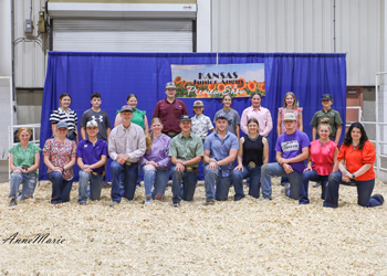These young ladies and gentlemen were elected to serve on the Kansas Junior Angus Association board of directors and are pictured at the 2025 Kansas Junior Angus Association Preview Show awards ceremony, June 8 in Hutchinson, Kan. Pictured kneeling front row from left are Molly Hill, Baldwin City, co-membership director; Kelsey Theis, Leavenworth, past president; Austin Woodrow, Emporia, president; Lyle Perrier, Eureka, president elect; Addie Haverkamp, Bern, vice president; Jackson McCurry, Colwich, second vice president; Cohen Navinsky, Winchester, secretary; Kaelyn Schilling, Goodland, treasurer; Sullivan Haverkamp, Bern, reporter; Cheyenne Brunker, Ottawa, historian; and Addison Burns, Valley Center, co-membership director. Directors standing back row from left are Eliza Rosenhagen, Cheney; Broxton Navinsky, Winchester; Ruby Hill, Baldwin City; Henry Perrier, Eureka; Eli Atkisson, Stockton; Ruby Shaver, Hillsboro; Aubree McCurry, Hutchinson; Avery Mullen, Ulysses; and Jett McCurry, Colwich, at large. Photo by Anne Lampe.