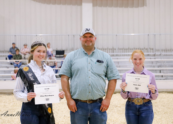 Eliza Rosenhagen, Cheney, left, and Molly Hill, Baldwin City, right, received the Kansas Angus Association Endowment — Angus Foundation Leaders Engaged in Angus Development (LEAD) scholarship at the 2025 Kansas Junior Angus Association Preview Show awards ceremony, June 8 in Hutchinson, Kan. Pictured presenting the scholarships is Cash Schilling, Kansas Angus Association president, center. Photo by Anne Lampe.