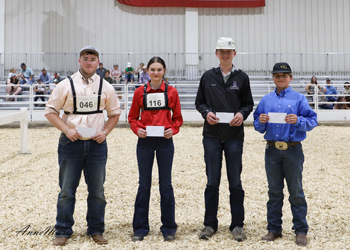 These junior Angus members won top honors in the intermediate division of team sales at the 2025 Kansas Junior Angus Association Preview Show awards ceremony, June 8 in Hutchinson, Kan. Pictured from left are Molly Hill, Baldwin City, first place; Corbin Russell, Paxico, second place; Eliza Rosenhagen, Cheney, third place; and Addison Burns, Valley Falls, fourth place. Photo by Anne Lampe.