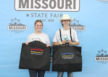 Bailey Schuering, Thompson, reserve champion, left, and Jace Pipkin, Republic, champion, right, won overall showmanship at the 2025 Missouri State Fair FFA Angus Show, Aug. 7 in Sedalia, Mo. Photo by Adam Conover, American Angus Association.